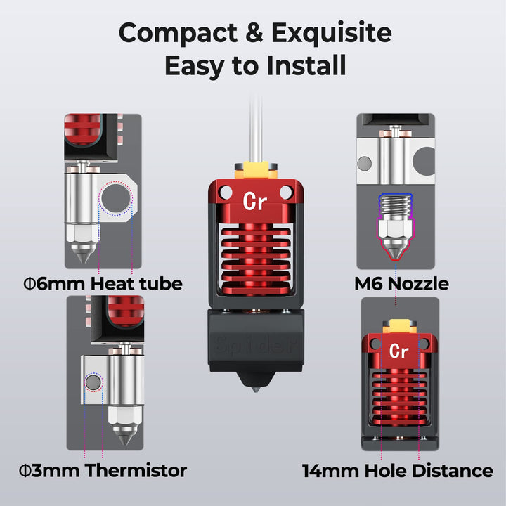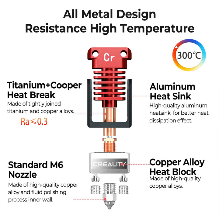 【Up To 300℃ High Temperature Resistance, Compatible With Most Filaments】 The upgraded CR Spider All Metal Hotend boasts a meticulously designed structure and carefully chosen materials, enabling it to withstand temperatures of up to 300℃. This exceptional capability allows for superior 3D printing results with high temperature filaments. Moreover, its compatibility extends to a wide array of filaments, including PLA, ABS, PETG, TPU, PP, PC, PEEK, PEI, Nylon, and many others.