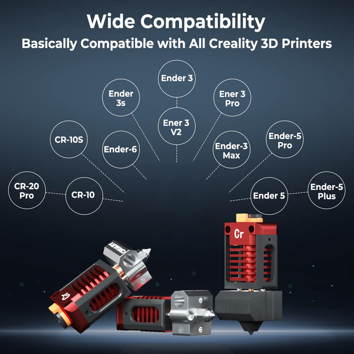 【Wide Compatibility】This all metal hotend kit for 3D printers is compatible with a wide range of models, including Ender-3, Ender-3 Pro, Ender-3 V2, Ender-3 Max, Ender 3s, Ender-5, Ender-5 Pro, Ender-5 Plus, CR-10, CR-10S, CR-10 S5, CR-10 S4, CR-10Mini, Ender-6, Ender-4, Ender2 Pro, Ender-2, CR-20, and CR-20 Pro. For some older models, please make sure its 32BIT MOTHER BOARD and 24V VOLTAGE, otherwise, it is not compatible.