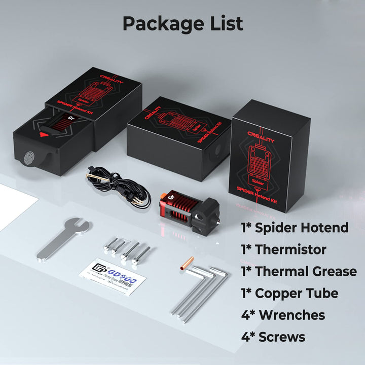【Simple Installation】 With modular standard interface design and universal standard nozzle, this upgrade Spider hotend kit is very easy to install, this kit included Spider High-temperature Hotend*1, Copper tube*1, M3×20 screw*2, Wrench*1, Hexagonal wrench*3, Thermal Grease*1